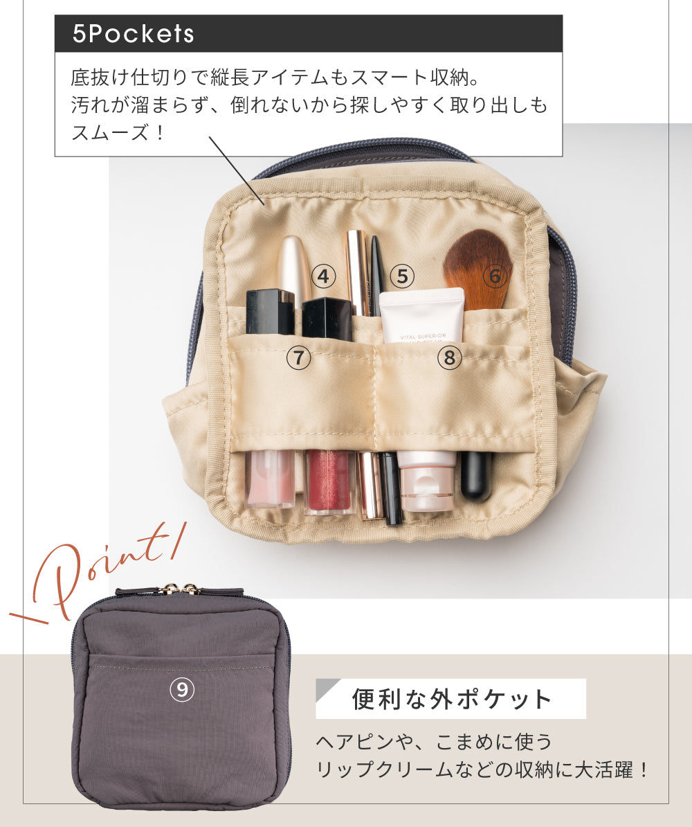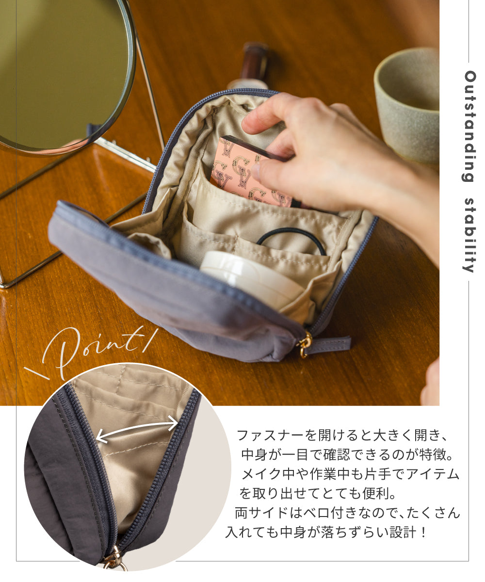 マチ付きのスクエア型で自立しやすく、メイク中も倒れにくい安心設計。開口部が大きく開き、中身を一目で確認できます。