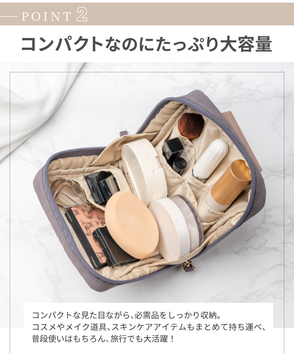 コンパクトサイズながら、フルメイク道具や小物をしっかり収納可能。旅行や外出先でも頼れる収納力です。