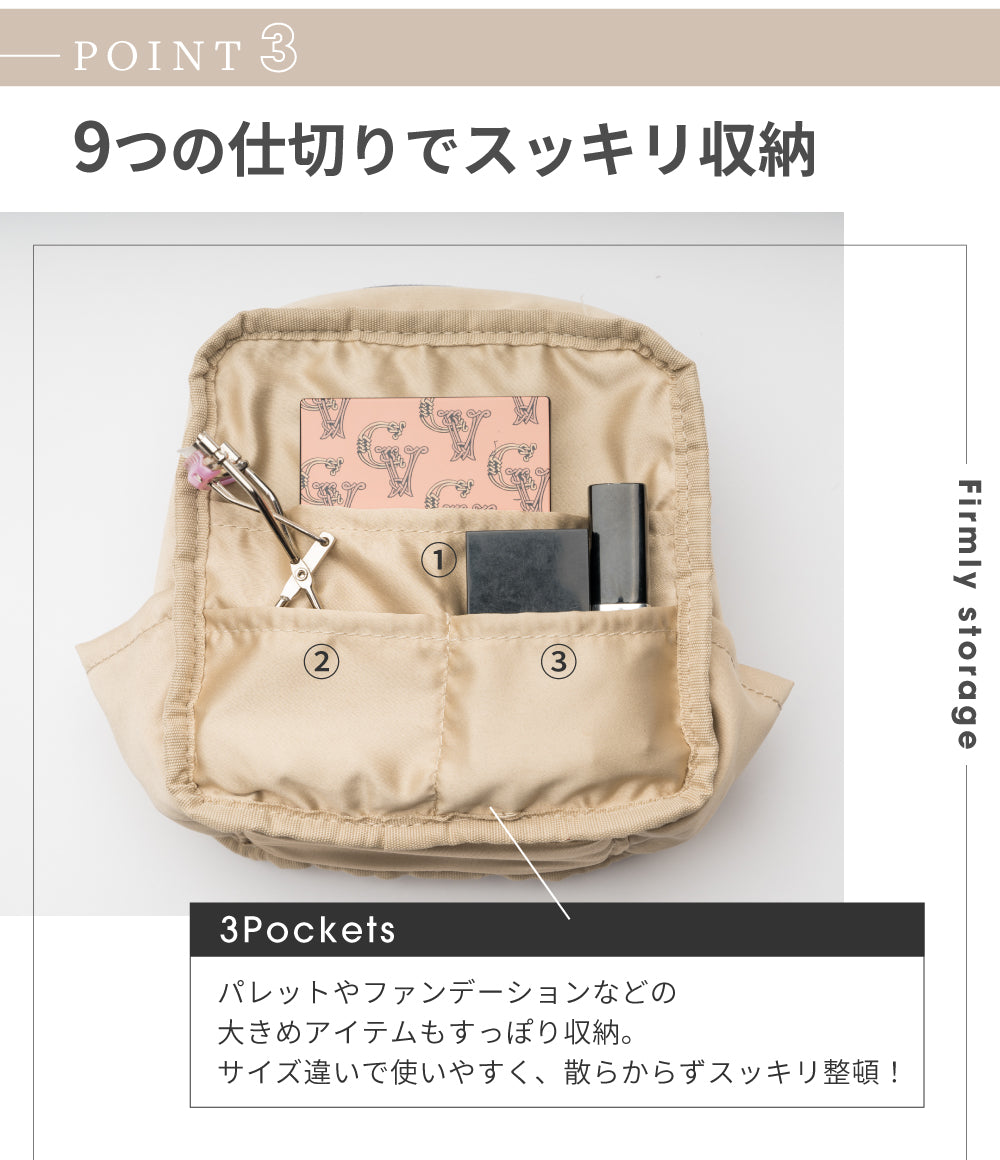 内部には9つの仕切りを配置し、リップやブラシなどを用途別に分けて収納可能。取り出しやすく整理整頓が簡単です。