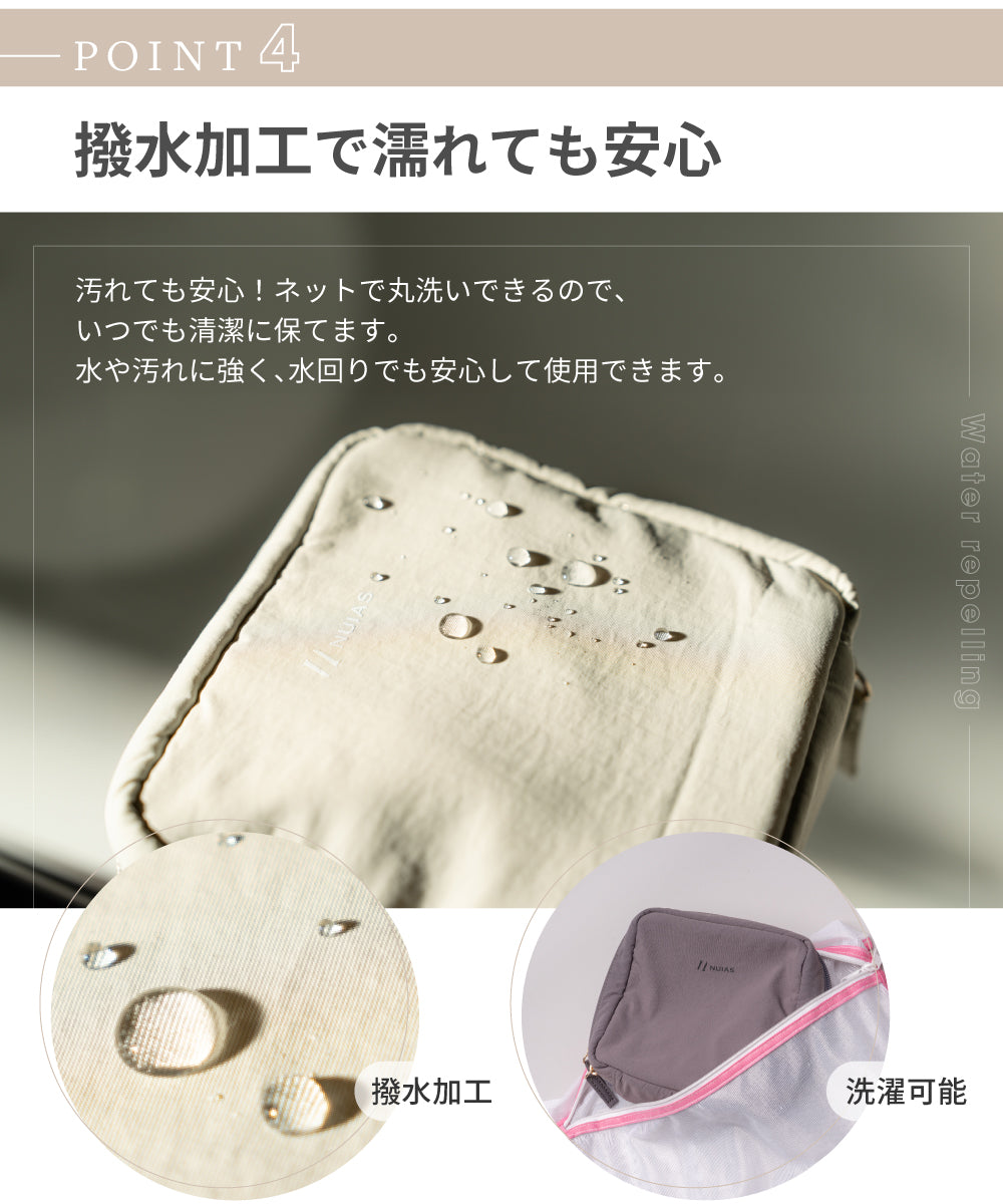 表地には撥水加工を施し、水や汚れに強い仕様。ネットに入れて洗濯できるので、いつでも清潔に保てます。